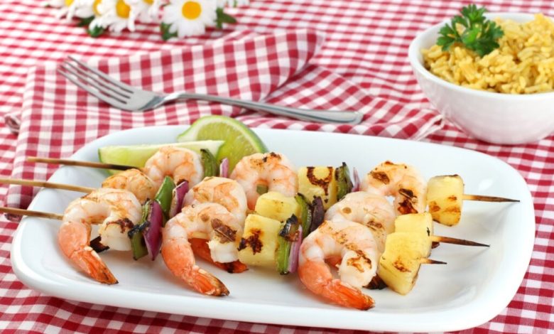 Espetinhos tropicais de camarão