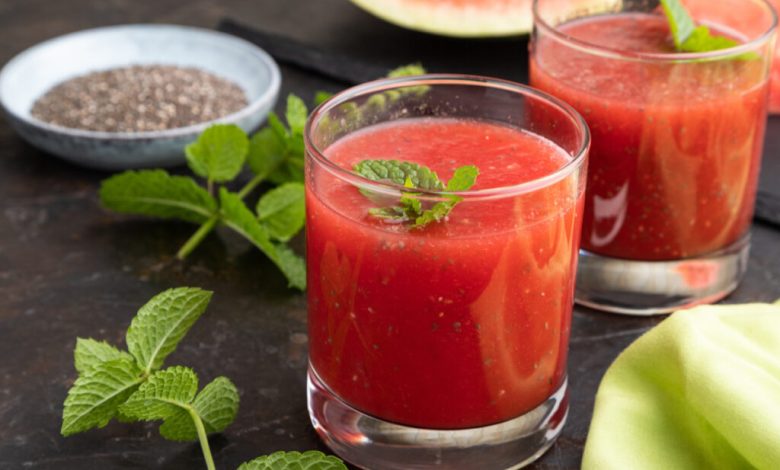 Em um liquidificador, coloque a melancia, a hortelã, o suco de limão e as sementes de chia e bata até obter uma mistura homogênea. Sirva em seguida.