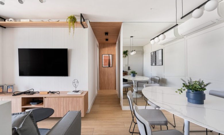 Marcenaria ajuda a remodelar a decoração do corredor sem pintura (Projeto: Natalia Salla | Imagem: FotoEstudio360)