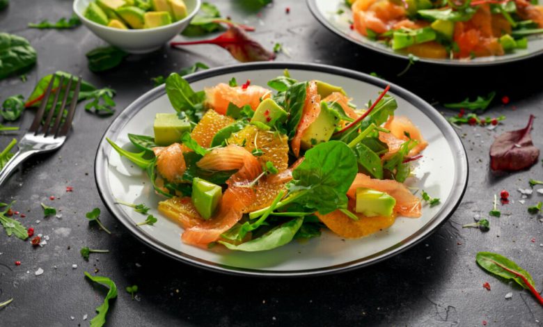 Em um recipiente, coloque as folhas de rúcula, o abacate, os gomos de laranja, o salmão e misture. Em outro recipiente, disponha o azeite, o suco de laranja, o sal, a pimenta-do-reino e mexa para incorporar. Despeje a mistura sobre a salada e sirva em seguida.