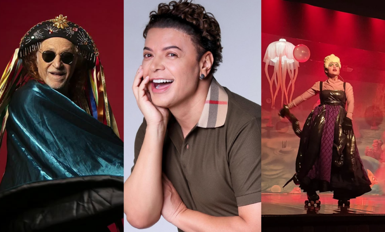 Montagem com Alceu Valença, David Brazil e cena do musical A Pequena Sereia, representando a diversidade da agenda cultural do fim de semana.