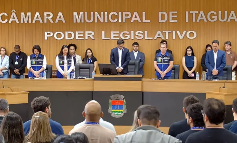 Membros da Câmara de Itaguaí em pé durante homenagem