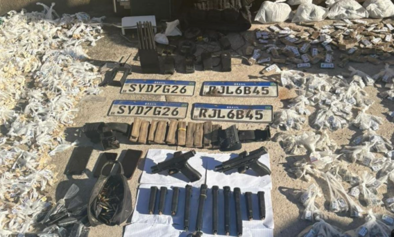 Após a abordagem, os cinco suspeitos foram capturados. Com eles, os agentes apreenderam duas pistolas, uma granada, munições, rádios transmissores e um bloqueador de sinal. Também foram encontrados entorpecentes e um veículo clonado, além de placas adulteradas.