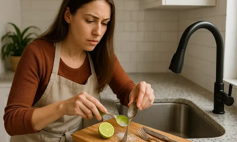 Corte um limão ao meio, polvilhe sal sobre a superfície cortada e esfregue diretamente sobre o talher. Deixe agir por alguns minutos e enxágue. Seque bem em seguida para evitar novas manchas.