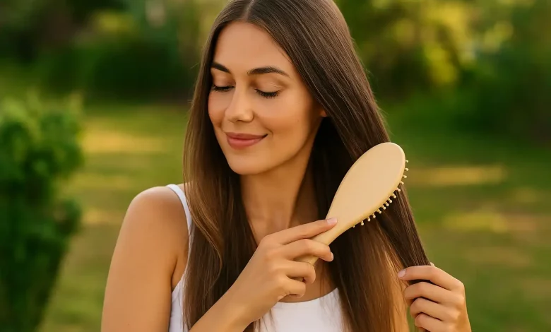 - Pente de madeira ou escova de cerdas naturais: ajuda a distribuir os óleos naturais ao longo do fio.