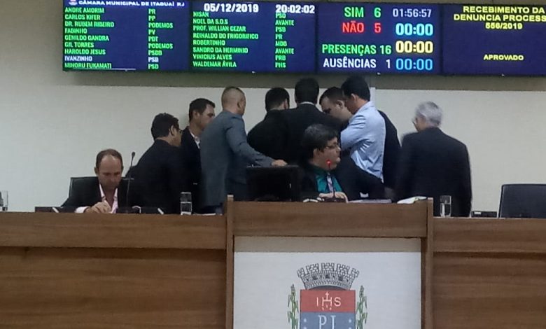 Segundo determinação da PJCMI, o vereador Waldemar Ávila também ficou impedido de votar, já que o parlamentar tem parentesco com vice-prefeito Abeilard Goulart. Portanto, dos 16 parlamentares presentes, apenas 11 vereadores estavam aptos a votar. A exceção era o presidente, que tem o voto de minerva, o que não foi o caso por se tratar de votação que exigia maioria simples. O vereador Ivan Charles não compareceu à sessão. Votaram a favor do prosseguimento da denúncia os vereadores André Amorim, Gil Torres, Genildo Gandra, Noel Pedrosa, Vinícius Alves e Willian Cezar. Do outro lado, manifestaram-se contrários os vereadores Carlos Kifer, Minoro Fukamati, Nisan Cesar, Roberto Lúcio Espolador Guimarães e Sandro da Hermínio.  Por maioria dos votos, como determina a Lei Orgânica, o recebimento da denúncia foi aprovado. Os membros eleitos para apurar as denúncias terão até 90 dias para apresentar parecer pedindo ou não a cassação do prefeito e do vice-prefeito de Itaguaí. Após a aprovação da denúncia, os vereadores deram continuidade à sessão, com a aprovação de requerimentos, indicações e pareceres presentes na pauta do dia