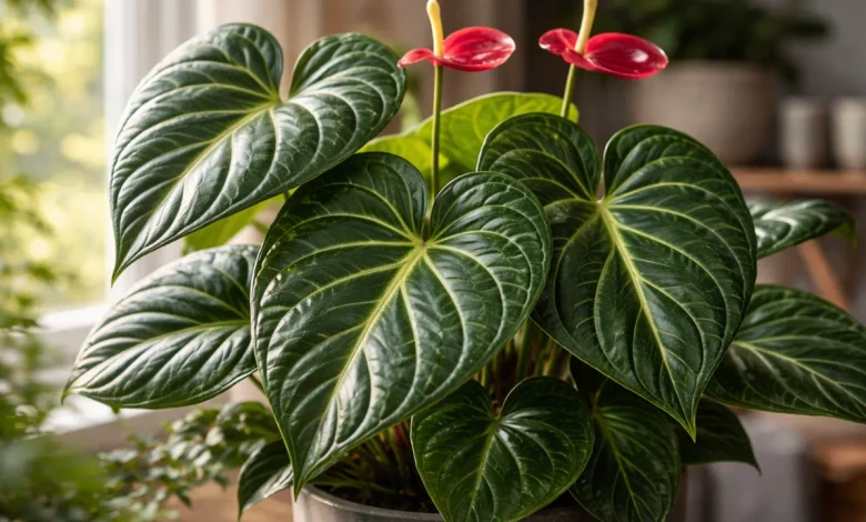Muita gente associa o antúrio apenas à sua flor (que, na verdade, é uma espata colorida), mas o grande charme dessa planta está na elegância silenciosa de suas folhas. Quando bem iluminadas, elas parecem esculpidas à mão, com nervuras tão precisas que lembram bordado.