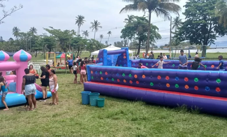 Crianças e familiares participam de atividades recreativas durante a celebração do Dia das Crianças