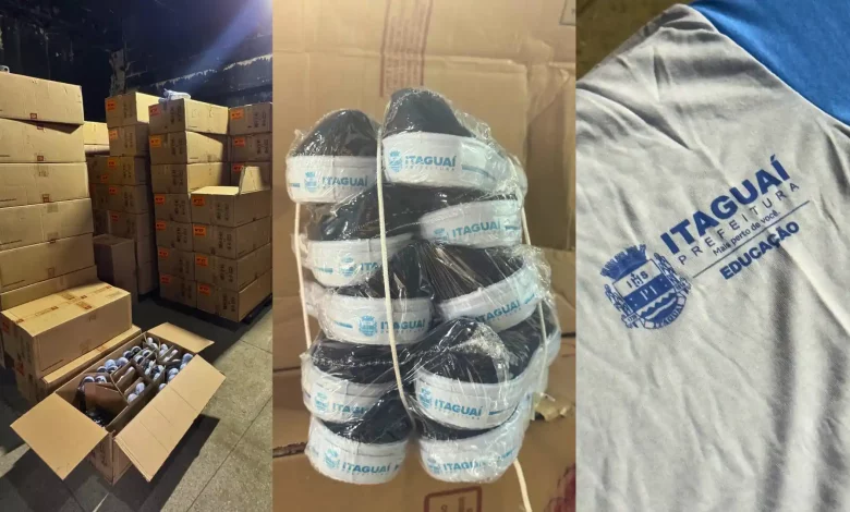 Foto mostra caixas de papelão empilhadas em galpão, pares de tênis pretos com solado branco identificados com o logotipo “Itaguaí Prefeitura” e uma camiseta cinza da rede municipal com o brasão do município e a palavra “Educação”.