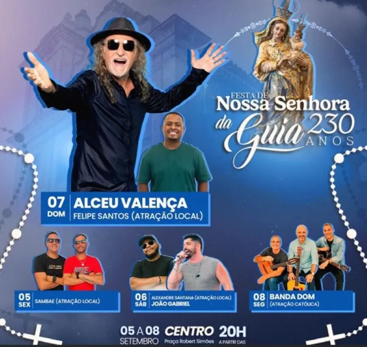 A tradicional Festa de Nossa Senhora da Guia 2025 começa nesta sexta-feira (5), em Mangaratiba, e promete atrair uma multidão ao Largo Sebastião Queiroz de Almeida, no Centro da cidade. A programação segue até o dia 8 de setembro e contará com seis shows gratuitos, com destaque para o cantor Alceu Valença, no sábado (7).