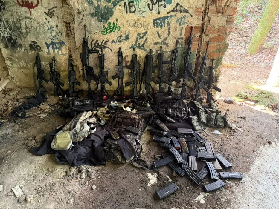 Arsenal apreendido por policiais em operação no Rio: fuzis, carregadores e equipamentos táticos foram encontrados em esconderijo de criminosos (FOTO DIVULGAÇÃO)