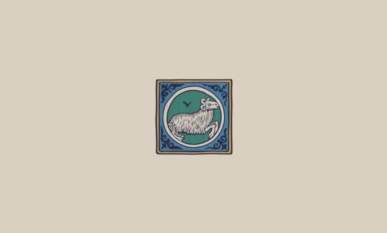 Ilustração do signo de Áries em um estilo medieval, mostrando um carneiro branco em fundo verde