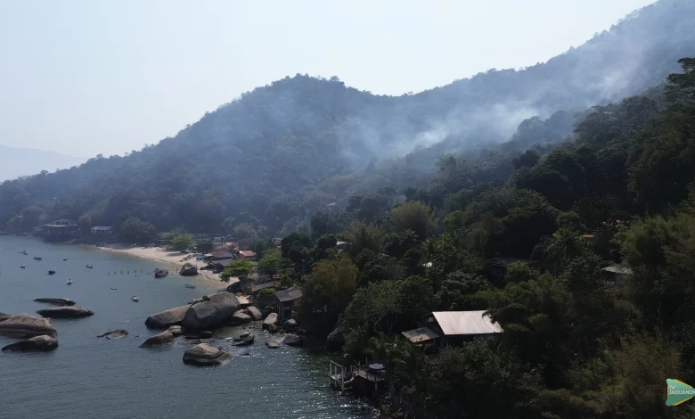 Fogo ameaça casas na Ilha de Jaguanum, Corpo de Bombeiros diz que atua para conter