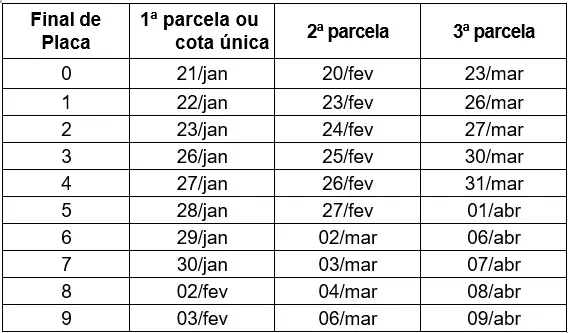 O cronograma de vencimentos terá início no dia 21 de janeiro para os veículos com placas terminadas em 0, cobrindo tanto a cota única quanto a primeira parcela. Portanto, os proprietários de veículos devem se atentar às datas para garantir o benefício do desconto.