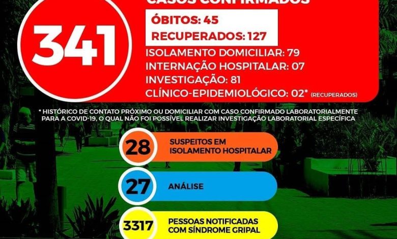 No último domingo (31), a prefeitura disponibilizou seu mapeamento diário de casos de coronavírus em suas redes sociais. Foram contabilizados 346 casos confirmados de covid-19. São 173 casos ativos: 79 em isolamento domiciliar, 5 em internação hospitalar, 87 em investigação, e 2 casos clínico-epidemiológicos; além de 46 óbitos e 127 recuperados – o Atual publicou uma matéria citando casos de pessoas que saíram vitoriosas da luta contra o coronavírus. De acordo com a prefeitura, não houve novos casos entre os dias 30 e 31, e apenas 5 registrados após o dia 29.