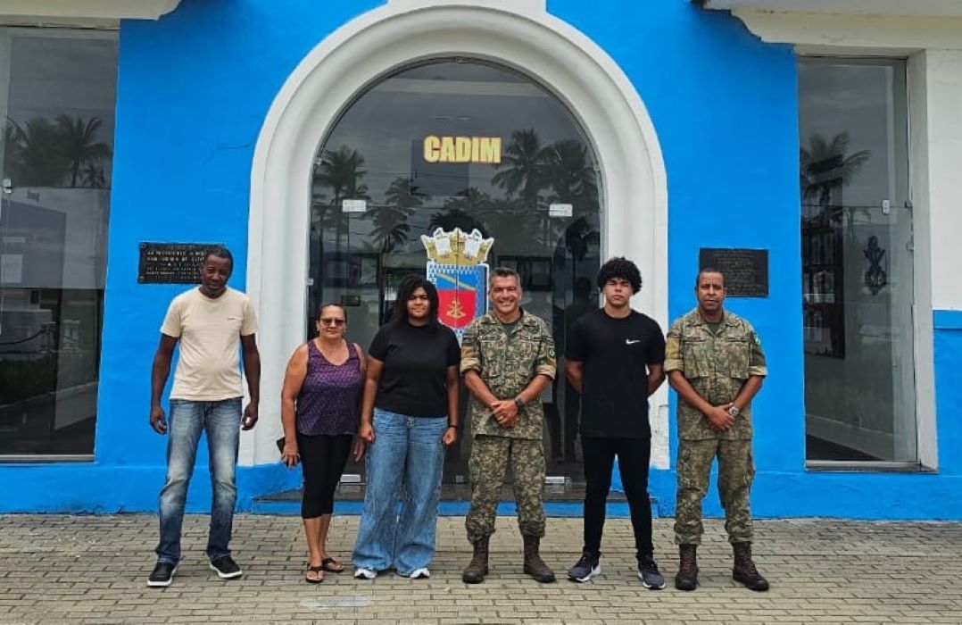 Fábio Marçal (presidente da Arqimar), Joeci Gomes (mãe de Lorena), Lorena do Nascimento, o comandante do CADIM, Nachard, Gabriel Santana e o capitão Leonardo, em encontro que celebrou a conquista dos jovens no concurso da Marinha do Brasil (FOTO CADIM)