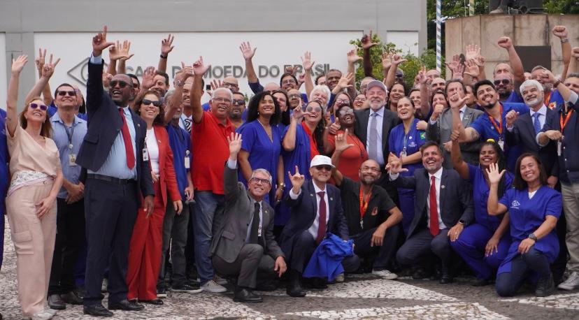 Presidente Lula e funcionários da Casa da Moeda na cerimônia de celebração dos 90 anos do salário mínimo (FOTOS: RICHARD CARRASCO).