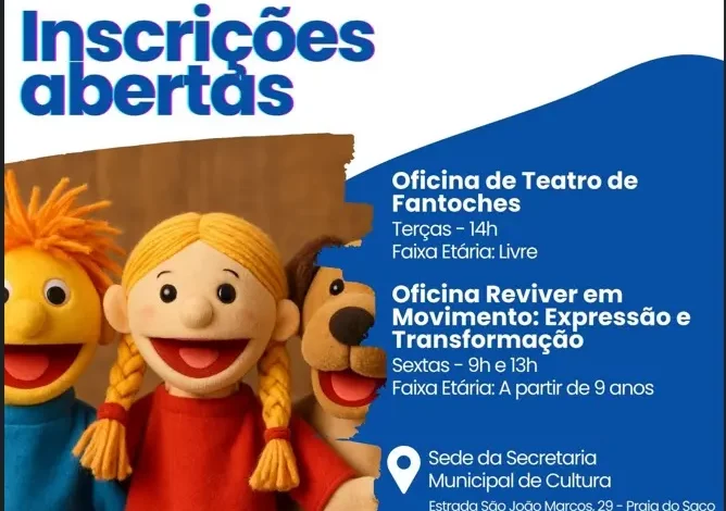Se você gosta de arte, criatividade e novas formas de se expressar, essa é a sua chance! A Prefeitura de Mangaratiba, por meio da Secretaria Municipal de Cultura, está com inscrições abertas para duas oficinas culturais gratuitas: Teatro de Fantoches e Reviver em Movimento: Expressão e Transformação. As atividades acontecem na sede da secretaria, localizada na Praia do Saco.