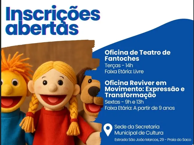 Se você gosta de arte, criatividade e novas formas de se expressar, essa é a sua chance! A Prefeitura de Mangaratiba, por meio da Secretaria Municipal de Cultura, está com inscrições abertas para duas oficinas culturais gratuitas: Teatro de Fantoches e Reviver em Movimento: Expressão e Transformação. As atividades acontecem na sede da secretaria, localizada na Praia do Saco.