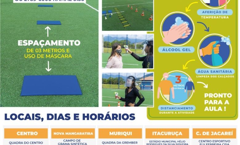 Seguindo as medidas de flexibilização diante a pandemia do Covid-19, a Prefeitura de Mangaratiba informou que as aulas ministradas por profissionais do Esporte terão um número limitado, com no máximo 10 alunos, com a realização do agendamento no local (no dia e horário do treino) ou por telefone 2789-6000 ramal 6136 para garantir sua vaga.