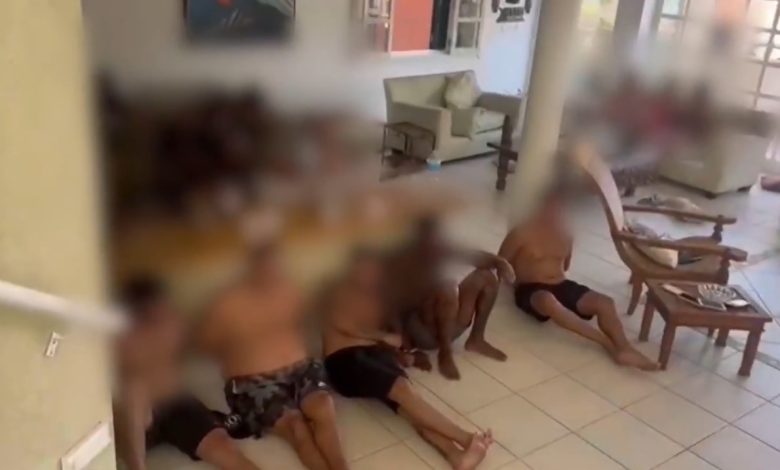A matéria exibe imagens feitas pela equipe da Delegacia de Repressão a Entorpecentes, nas quais suspeitos aparecem rendidos em uma mansão à beira-mar alugada, com quatro suítes e piscina.