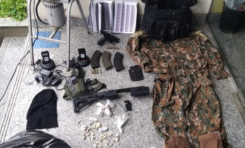 Na ação, agentes do 33º BPM (Queimados) apreenderam um carro, uma pistola, munições, cápsulas de cocaína, trouxinhas de maconha, frascos de loló, comprimidos de ecstasy, bases de rádio, baterias, um liquidificador industrial usado no preparo das drogas, carregadores de fuzil, um kit de adaptador para pistola, base para guardar as armas, touca ninja, colete a prova de balas, farda camuflada do Batalhão de Operações Policiais Especiais (Bope) e material para embalar as drogas.
