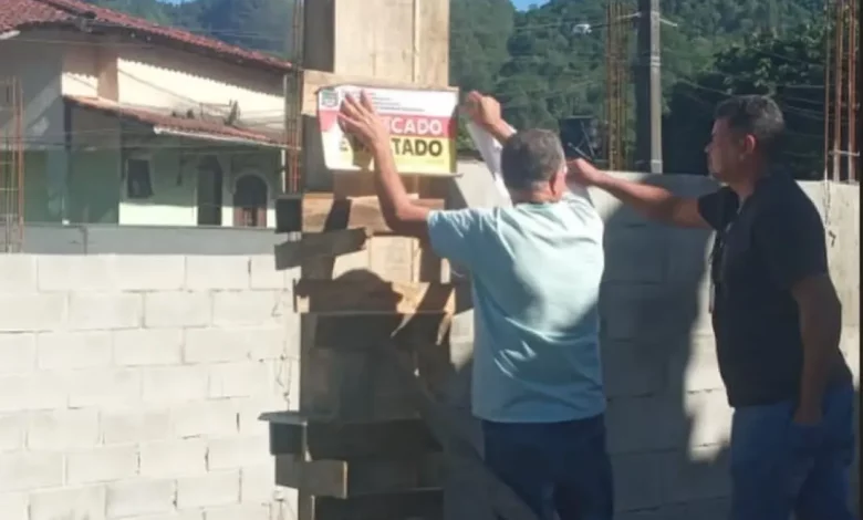 Agentes da Prefeitura de Mangaratiba fixam placa de embargo em construção irregular