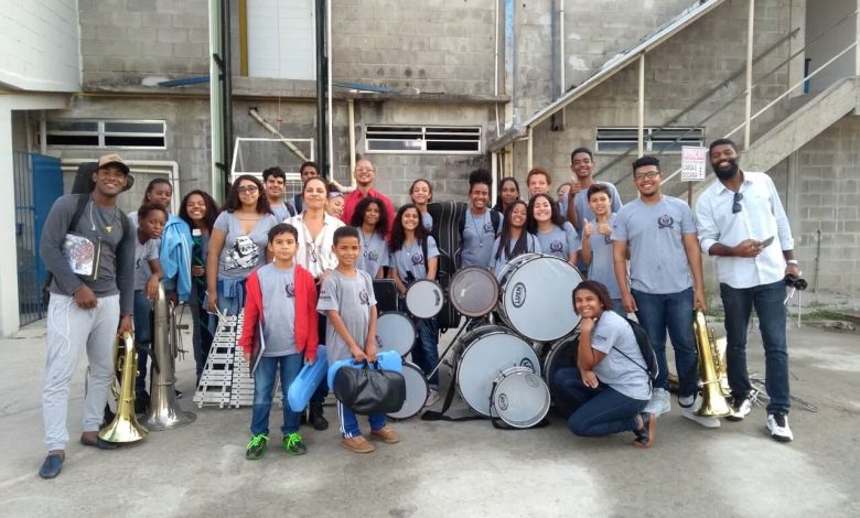 ALUNOS da orquestra com o diretor Washington Tadeu