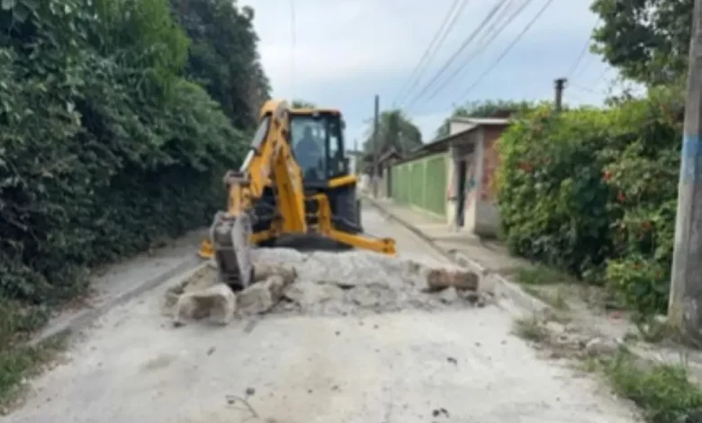 Retroescavadeira remove bloqueio de concreto durante operação da PM nos bairros Engenho e Ueda, em Itaguaí (FOTO REPREDUÇÃO/PMERJ)