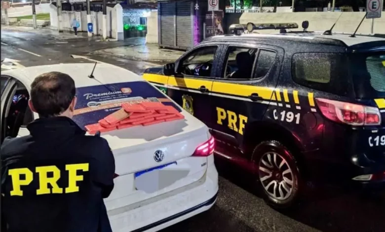 Agente da PRF ao lado de veículo apreendido com tabletes de cocaína