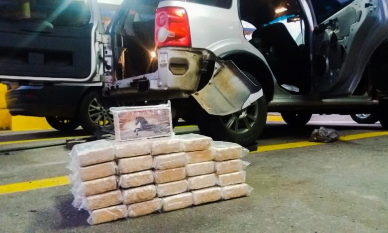 Ainda de acordo com a PRF, em uma revista inicial, foram encontrados pinos de cocaína. Após uma fiscalização mais minuciosa no veículo, os agentes encontraram 40 tabletes de cocaína que estavam em um fundo falso no para-choque traseiro. No total, havia aproximadamente 40 quilos da droga.