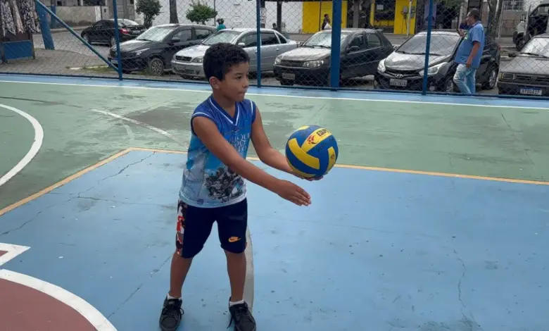 Criança participa de atividade de vôlei em quadra poliesportiva revitalizada em Mangaratiba