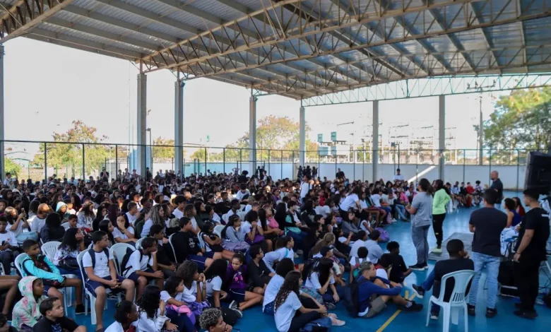 Estudantes lotam a quadra esportiva durante apresentação do projeto.