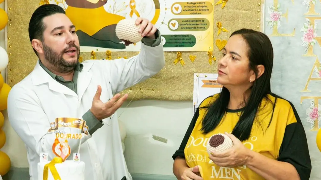 Profissionais de saúde realizam demonstração sobre amamentação durante ação do Agosto Dourado, campanha que incentiva o aleitamento materno (FOTO INSTAGRAM/ @PREFEITURAITAGUAI)