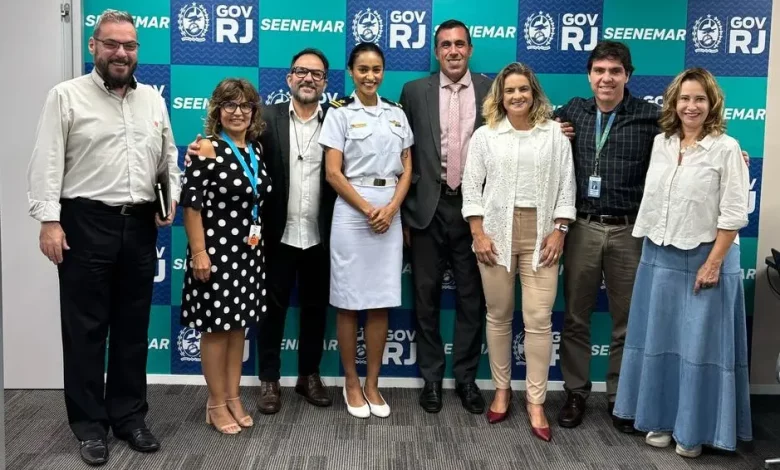 representantes da comunicação do setor nuclear do estado do Rio de Janeiroi pousa para foto diante de backdrop da Seenemar