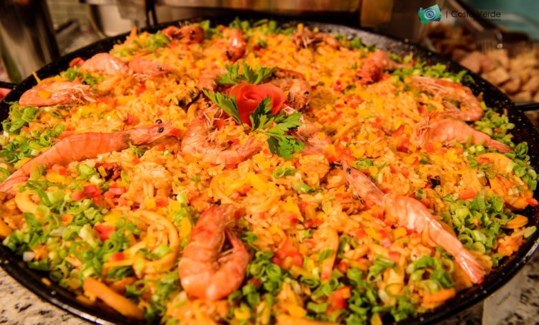 UMA SOFISTICADA paella figura na lista de pratos na plataforma de iguarias do restaurante