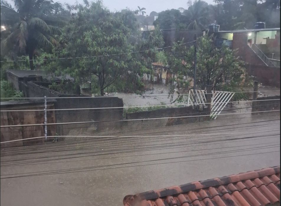 Rua Nossa Senhora das Graças, no bairro Califórnia, em Itaguaí, ficou alagada após o temporal que atingiu a região durante a madrugada desta quarta-feira (17) (FOTOS REPRODUÇÃO REDES SOCIAIS)