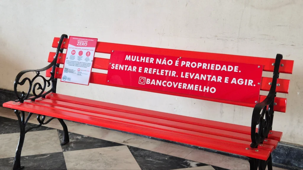 O Banco Vermelho funciona como uma intervenção urbana criada para chamar atenção para a violência contra mulheres. A estrutura reproduz um banco de praça e utiliza a cor vermelha como sinal de alerta. O projeto apresenta informações educativas sobre violência de gênero e orientações sobre canais de denúncia. Cada banco traz mensagens sobre os cinco tipos de violência previstos na Lei Maria da Penha. O material também divulga o canal nacional de denúncias Ligue 180, utilizado por vítimas ou testemunhas de abusos.