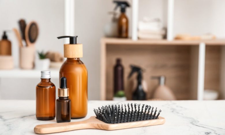 Produtos para cuidados com o cabelo, incluindo frascos de vidro âmbar e uma escova de madeira, dispostos sobre uma superfície de mármore branco