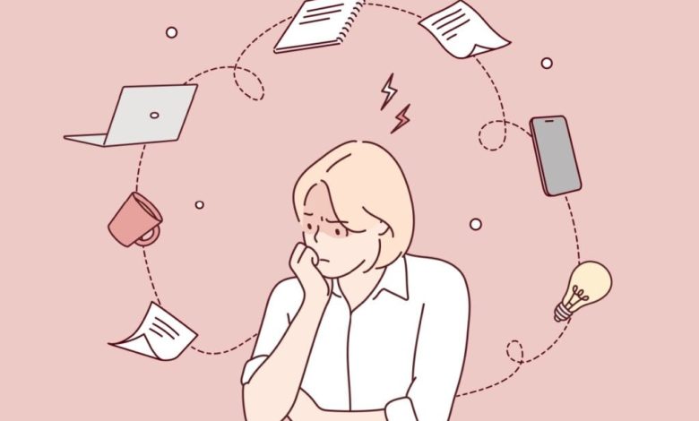 Ilustração de uma mulher preocupada com as tarefas do trabalho